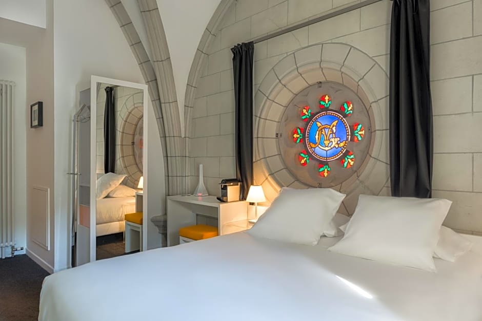 These rooms are located either in the apses, to either side of the nave of the vaulted chapel (now the lobby), or in a suspended room with views over the lobby's stained-glass windows, visible from the bed.